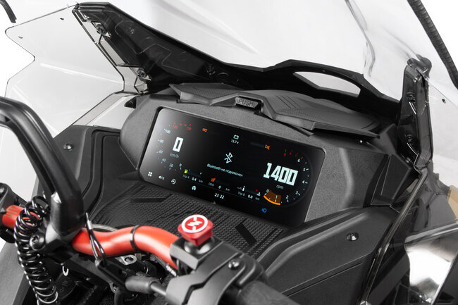 ЖК приборная панель 10,25 дюйма: спидометр, тахометр, одометр, счётчик м\ч и пробега, индикация включённой передачи, температуры, указатель уровня топлива, мультимедия, индикация подогрева ручек руля, курка газа, сиденья.